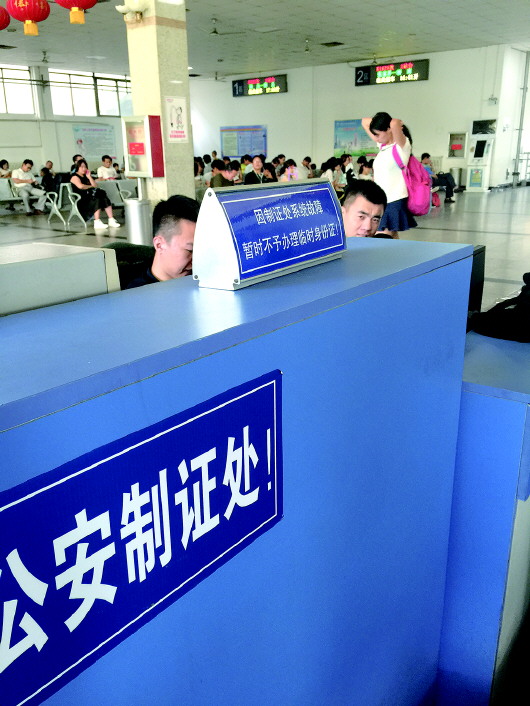 ▲济宁火车站派出所的公安制证处摆放着“系统故障”的牌子。