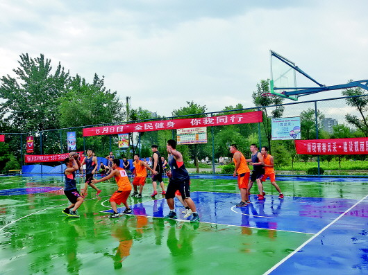 ◥刚开放的腊山体育公园正在进行篮球赛。