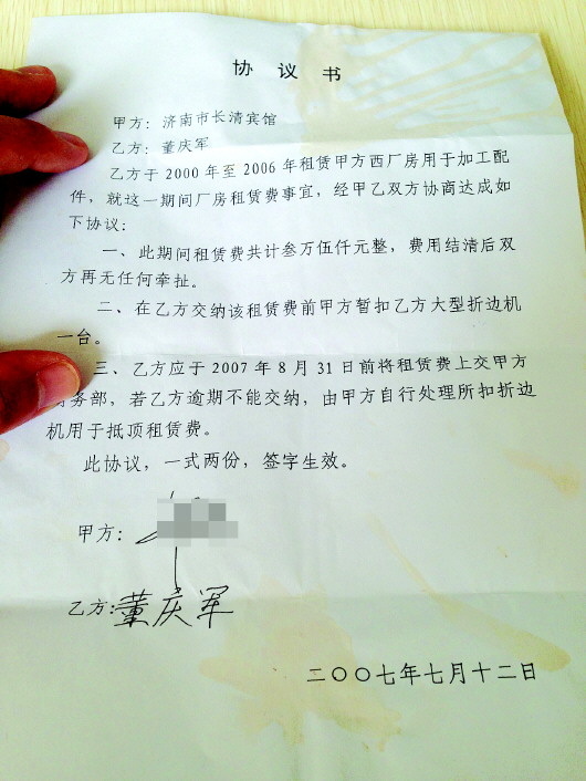 从2007年7月起,长清宾馆开始催促董庆军补交租赁费,并扣押了他两台生产机器。“除协议书中规定的一台6米长、3米高,价值17万多元的大型折边机外,宾馆还多扣了我一台机器。”董庆军说。