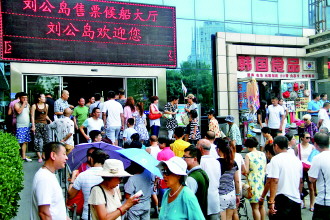 6日,不少游客在刘公岛候船大厅门口排队登船。当日,刘公岛景区日接待游客量破万。据了解,威海市暑期旅游市场火爆,目前来威游客中,省内游客约占一半,省外客人主要来自北京、上海等地。