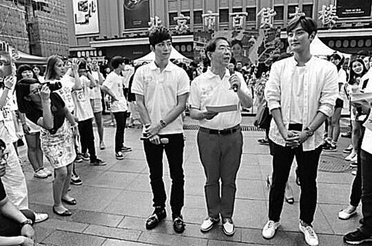 为吸引更多中国游客前往首尔旅游观光,首尔市长朴元淳(中)5日在北京王府井举行“首尔之日”宣传活动,安七炫(右一)和陈学冬等韩中两国艺人参加活动。