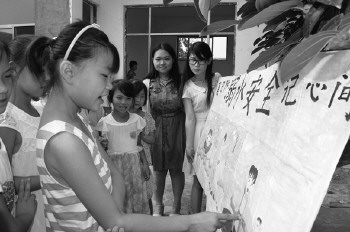 8月4日,聊城大学商学院社会实践队到茌平洪官屯镇举办“夏日防溺水”活动,吸引了众多孩子的目光。 本报记者 李军 通讯员 姚春晓 摄