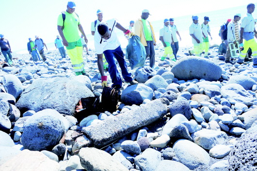 8月10日,搜寻人员在发现第一块MH370残骸的法属留尼汪岛东部圣安德烈海滩附近捡起一块金属残片。 新华社发