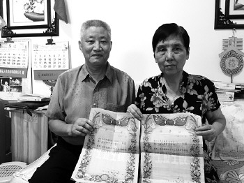 郑大娘和记者聊着,李大爷则从屋里拿出个小黑包,笑着说这里都是珍藏的宝贝。打开后拿出两张保存完好的结婚证,郑大娘一看都愣住了。“结婚后这两张结婚证我就一直保存着,搬了好几次家,也总是专门它收起来。”李修松说,那时的结婚证就像张奖状,有五星红旗、牡丹花还有大喜字,远看还能看到“互敬互爱”四个大字。
