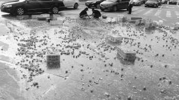 随后,附近一位环卫工人也赶过来帮忙收拾,“这得损失不少钱,鸡蛋碎在地上太滑了,我已经联系了环卫处,清扫车一会儿就到了。”