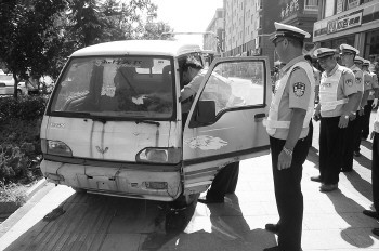 7日,在潍坊市昌乐县,交警正在清理一辆“僵尸车”。为了市区形象,维护正常的道路交通,昌乐县公安局联合城管执法局及辖区派出所,对城区相府锦苑门口几辆长期占道停放、无人问津的“僵尸车”进行了清理整治。 本报记者 孙国祥 通讯员 刘涛 摄影报道