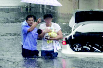 民警郭光富立即安排协警设立警戒带,让过路车辆绕行,同时带领协警踩着齐腰的积水,来到车旁。透过车窗玻璃,郭光富看到,被困在车内的是一对年轻夫妇和一名婴儿。郭光富及协警想合力从车外面打开车门,但积水太深,压力太大,经过多次努力都没有打开车门。此时,降雨大了起来,民警先让司机段先生摇下后车窗玻璃,把婴儿从车内递了出来,然后再把大人一一从车窗救了出来。将人救出来后,民警立即用警车将婴儿及其母亲送到医院进行检查。随后,现场的其余人合力将轿车推出危险区。
