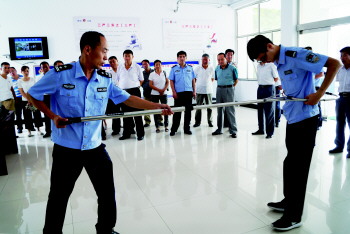 桓台县公安局果里派出所民警现场展示伸缩制暴钢叉使用方式。 本报通讯员 高艺真 摄