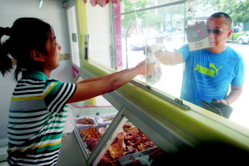 高鹤瑞将商品递到顾客手中。 本报记者 樊伟宏 摄