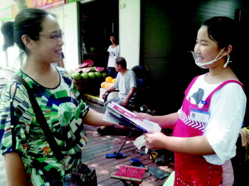 李文沛向购物的顾客发放报纸。 本报记者 樊伟宏 摄