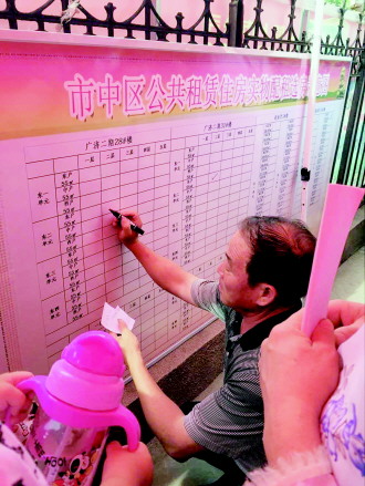 10日上午8点半,符合条件的公共租赁住房申请者在市中区住房办大厅,按照规定序号陆续选房。记者获悉,此次选房是市中区第二批公共租赁住房实物配租,共有705户申请者从796套房源中选取满意住房。左图中,选房者在房源表上勾选自己选好的住房。 本报记者 刘婷婷 摄
