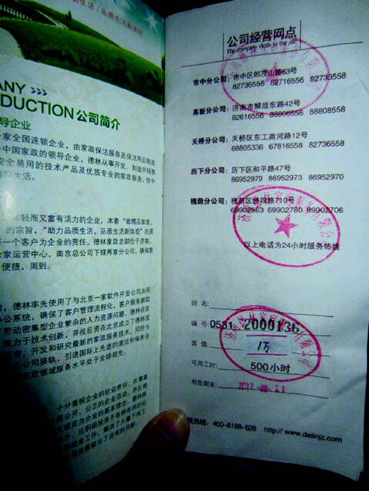 “2014年9月份,我从网上找到了这家德林家政。当时跟他们那边一个叫徐萍萍的经理沟通,对方说最少一下子要预交1万元。我就觉得一次交这么多有些不放心,就跟他们协商说能不能先交3000元试用一下,后来对方就同意了。最后,我们定下来,周一到周五的上午9点到11点,他们给我们做中午饭、打扫卫生,我们给他们每小时20块钱。”金先生称,当时自己与德林方面并没有签订协议,只收到了一张没有公司印章的收据。
