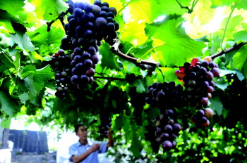 葡萄的成熟期正值本地的汛期,栽植葡萄10多年的许建一直在试验葡萄避雨设施。在他的葡萄园里,每个葡萄藤架上都罩着塑料薄膜,少见腐坏裂果的葡萄。“这是很简易的竹木结构,架好支架撑上薄膜,简单但挺有效。”许建说,经过五六年的实验他发现,遮盖上薄膜可以有效减少霜露,减轻降雨影响。“叶片上附着的霜露、雨水少,病虫害相应就少很多,可以少打七八次农药,虽然现在协会控制使用的都是无公害农药,但是使用越少葡萄肯定越好。”