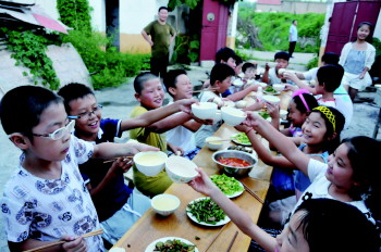 11日傍晚,来自张店的城市小朋友和淄川区响泉村的小伙伴们一起做了一桌丰盛的晚餐,大家举杯互相庆祝,一起分享合作的美味。当日,由本报和漱玉平民大药房联合主办的第三季“用爱圆梦·不一样的暑假”来到了淄川区太河镇响泉村。9名来自张店的城市小朋友与山村里的小伙伴结成对子,一起拔草做饭,共同享受大山深处的辛苦与欢乐。 本报记者 王鸿哲 摄影报道