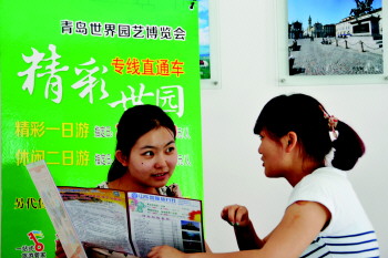 张店人民西路一旅行社工作人员向顾客介绍旅游线路(资料片)。