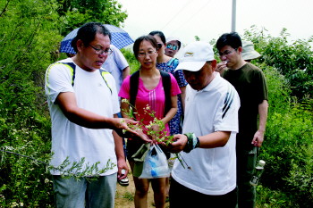 在山东中医药大学高德民教授的带领下,专家组沿着天地谷向深山中前行,边走边寻找药材,一路上高德民带领大家认识各种中草药,了解所见中草药的性状特征和功能。此次采药活动,专家组在崎岖山路上步行了6个多小时,学习认识了50余种药用植物。