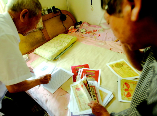 早晨7:30,出发前,袁永福老人(左)和儿子准备当年的资料。