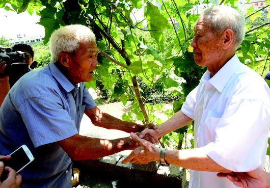 袁永福下车后,先整理了一下衣服,脚步明显快了起来,把年轻人都落在了后面。在屋里的91岁的滕光义听到声音也坐不住了,连拐棍都没有拄就迎了出来。一见面,两双手就紧握在了一起。“没变样!没变样!”袁永福嘴里念叨着,滕光义激动地嘴巴张了张,一句话都没说出来。