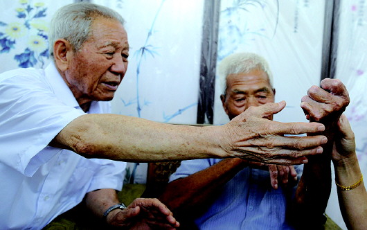 13:10,滕光义满是伤痕的手臂勾起两位老人对残酷岁月的回忆。