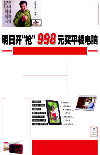 ● 千万巨资打造工厂直销,清华同方中老年平板电脑3折本周五开抢 ● 200部特惠购机,另送298元评书唱戏机+价值128元8G内存卡(限前100名) ● 上千首歌曲、几百部评书、几百部广场舞……自由选择,随时更新