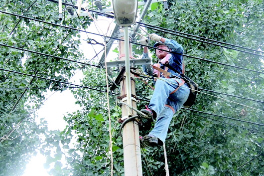 电力工人冒着酷暑工作。