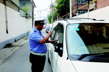 7月30日交警部门将昌盛胡同设为由南向北单向通行,并禁止违法停车。8月12日,执勤交警依法首次对违停的7辆车做出处罚。 本报记者 张磊 通讯员 张亚磊 摄影报道