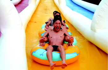 据英特堡城市漂流水上乐园现场负责人华冰介绍说,英特堡城市漂流水上乐园地势变化较明显,在山坡最高点不仅可以尽览整个金沙滩沿线海滩的美景,更能充分感受整个啤酒节的独特魅力。园区的充气漂流滑道国内最大、长度最长,也是唯一将大海、沙滩、森林结合起来的水滑道。在最东侧的滑道是激情滑道,滑道长度100米;中间的滑道是森林滑道,滑道长度258米;西边的滑道叫欢乐滑道,长度是150米。