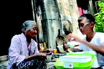 孩子们看望81岁的王桂兰老人,王岩给老人讲解药物的使用方法。 本报记者 王鸿哲 摄
