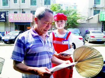 小售货员年书璇向过路行人发放喜旺报纸。 记者 唐菁 摄