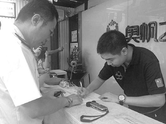 游泳馆工作人员在处罚书上签字。 本报记者 刘腾腾 摄