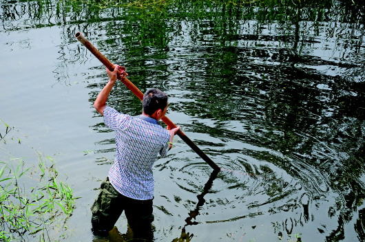 刘安然村张书记称,济东高速工作人员在河内取完泥土后并未进行填埋,导致河中形成一深坑。为确切得知该坑的深度,记者找来附近的脚手架插入坑中,发现约有5米进入泥水中,完全可淹没两个成人。