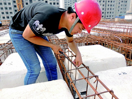 何雨林说:“钢筋工干的就是又脏又累的活,还有一定的技术含量,怎样巧妙地避开各种危险,用最快的速度将手底下的钢筋编好非常重要。当然穿梁筋属于比较累的活,还是与技术有关系,熟能生巧。”