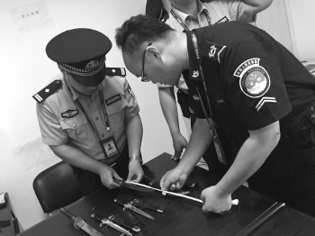 11日,一名来自瑞士的游客携带4把刀(工艺品)乘飞机,被被济宁曲阜机场的安检人员查到,因为所携带的4把刀的尺寸超过携带的范围,被济宁市公安局机场分局的民警收缴。图为安检人员和民警测量刀的尺寸。 本报记者 庄子帆 摄