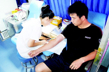 天津危险品仓库发生爆炸事件后,德州市中心血站进入紧急备血状态,全市10个献血点延长献血时间,8月13日,德城公安特巡警大队50名民警齐聚中心广场,集体献血。