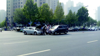 13日上午10时许,湖滨南大道兴河湾小区门口,出小区的轿车与北行商务车相撞,所幸只是轻微刮擦,没有人员受伤。 本报记者 徐良 摄