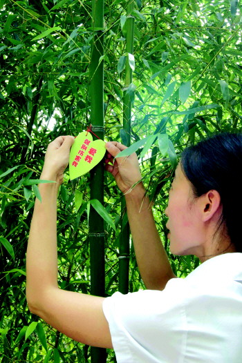 8月10日上午,崂山风景区棋盘石游览区工作人员在景区主要游览路的竹园沿线,栓挂制作精美的绿叶象形友情提示牌,“爱我请不要伤害我”“你刻我,我疼”……一个个宣传文明出游、制止乱刻乱画不文明行为的提示牌伴着竹叶在风中摇曳。