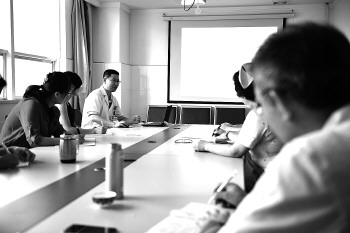 血管外科的医务人员利用空闲时间进行内部业务学习培训。