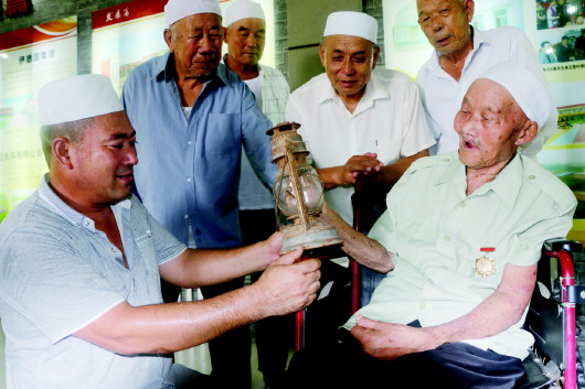 13日,无棣县车王镇五营后村90岁的抗战老兵冯树山老人(右)来到无棣县第一个党支部事迹陈列馆,向村民讲述抗战故事。冯树山老人于1943年参加“回民支队”,曾参加过济南战役、淮海战役等大战役,像解放无棣、沧县等小型战斗不计其数。在战斗中,老人的腿部受了伤,到现在还行动不便。抗战胜利70周年到来之际,为了让群众接受到爱国主义教育,该县组织开展了“听抗战老兵讲故事”系列活动,教育群众牢记历史,勿忘国耻。 本报通讯员 蒋惠庆 本报记者 王晓霜 摄影报道