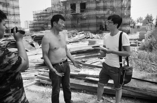 本报记者采访跳楼者(左)。