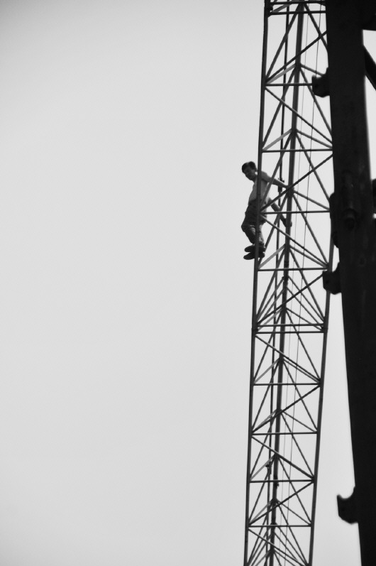 跳楼者站在塔吊一侧,并脱掉了上衣。