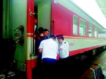 青岛客运段烟京车队四组全体乘务员视旅客为亲人,力所能及的帮助旅客解决旅行困难。图为帮助残疾旅客下车。 (毕凯)