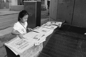 “卖报一点都不累,像玩儿一样”,这是贠若晴见到我们时说的第一句话。天真无邪的笑容让人很容易就能记住贠若晴,看到她时她正合报纸,小小的个头站在石凳下面认真仔细的一版版放好,很是乖巧,让人忍不住想要怜惜她。难怪报纸卖得快,每天像玩儿一样。爱笑的女孩运气都不会太差,特别是爱笑又认真的女孩儿。