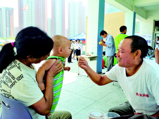 随着救援抢险的展开和事故信息的公开,16日,人们正在从惊慌中恢复平静,在泰达开发区第二小学安置点,来自四川的一家人给六个月大的孩子喂饭。