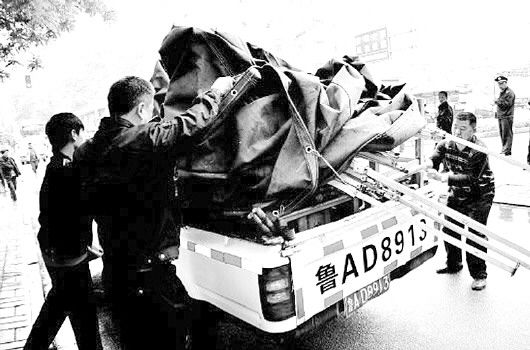 ▲济南城管执法人员对非法露天烧烤摊进行取缔。 (资料片)