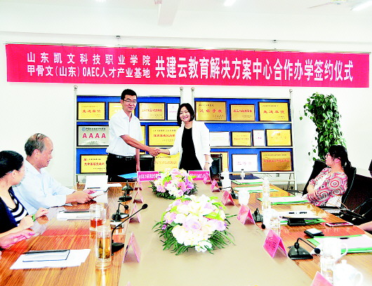 本报讯 记者从山东凯文科技职业学院获悉,为充分发挥校企双方教育资源和技术优势,为我国软件和IT行业发展培养更多的高素质复合性应用型IT人才。日前,山东凯文科技职业学院与甲骨文(Oracle)山东OAEC人才产业基地在凯文学院共同签署了山东凯文科技职业学院与甲骨文(山东)OAEC人才产业基地“云教育解决方案中心”合作办学共建服务协议。