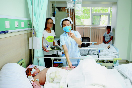 7月25日,家人将孩子转到了省立医院。“孩子来的时候很严重,全身多处烧伤,烧伤面积达45%,且都是最严重的三度烧伤,高烧41度。”省立医院烧伤和创面修复科主任薛文君说,“现在孩子已度过休克期和急性感染期,孩子的肢体得以保全,现在进入了创面修复期。”由于孩子烧伤面积较大,需进行多次植皮,“目前已做了三次手术。”