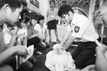 志愿者示范应急救护知识。 本报记者 赵金阳 摄