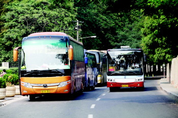 16日,在植物园外的郧阳路上,一排外地牌照的旅游大客车停在马路上,占用了一个车行道,还有一辆大客车竟停在206路公交站牌内下客,阻碍了公交车进站。周边居民介绍,进入旅游旺季,不少外地旅游大客车违法停车,给公交车和其他私家车带来了不便。