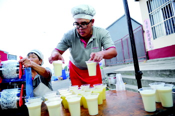 马麟将豆浆和小米粥进行分装。