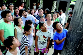 石碑上镌刻了许多名人诗词,孩子们沉浸在浓厚的文化氛围中。
